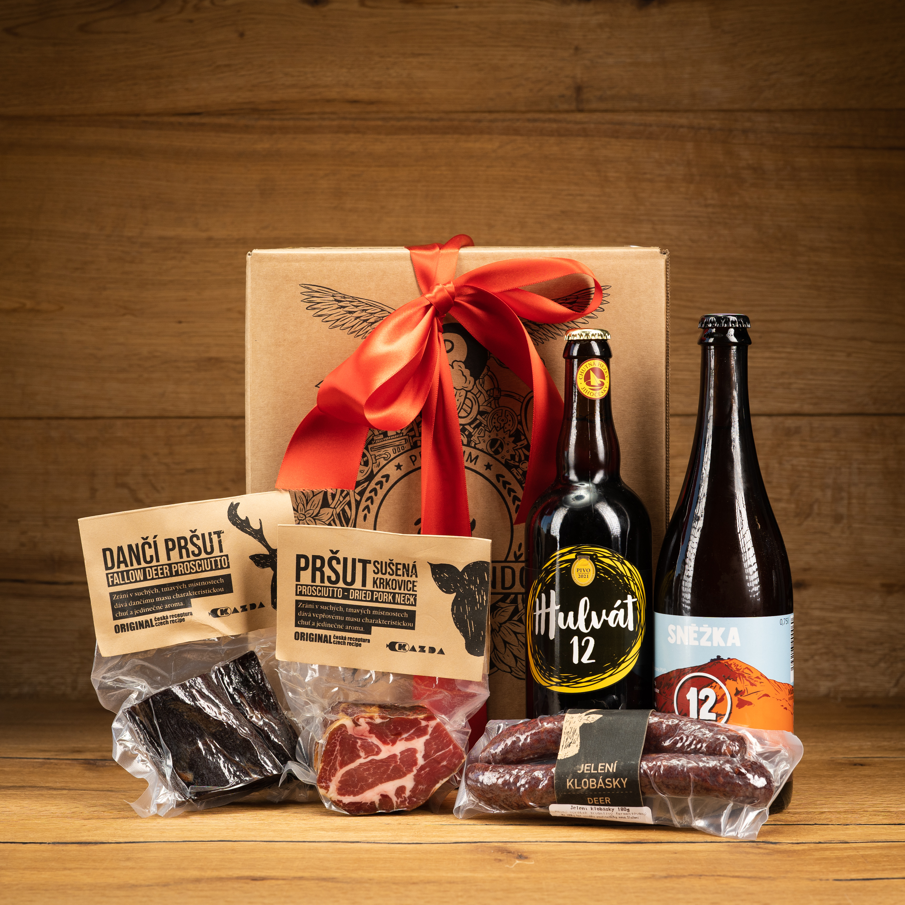 Dárkový balíček "Gurmánský zážitek": Skvělý dárek pro milovníky českých piv a lahodných pršutů. Obsahuje dvě exkluzivní piva, dančí pršut a sušený pršut ze zralé krkovice, rovněž jelení klobásky. Pro dokonalý chuťový zážitek.