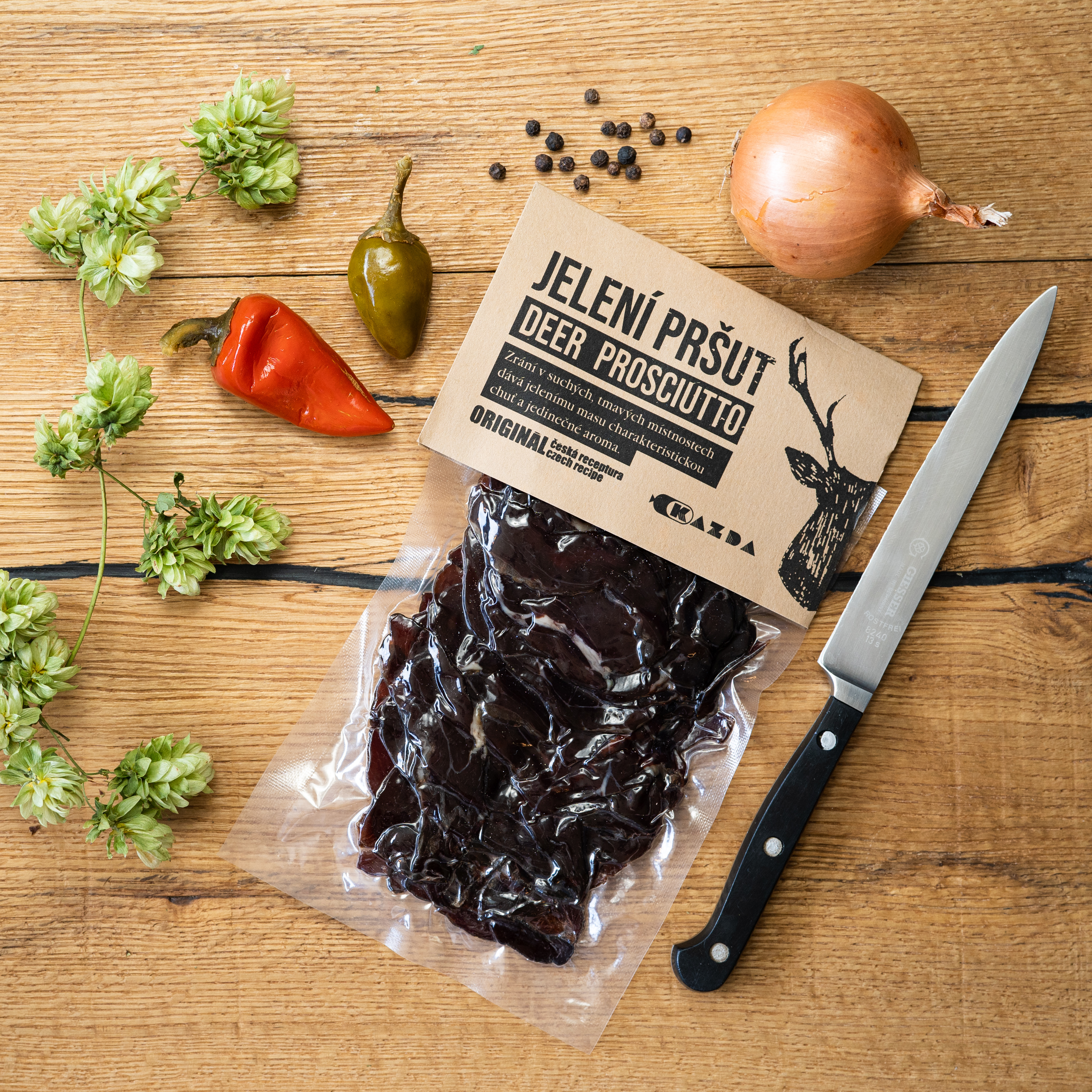 Tři měsíce sušený jelení pršut z malé uzenářské výrobny: Přírodní krásou inspirovaná lahůdka s bohatou divočinnou chutí a delikátním aroma. Každý kousek prošel pečlivým zráním, čímž vytvořil harmonii kořeněných tónů a nádherné struktury. Tento pršut je dokonalým doplňkem pro vaše gurmánské chvíle a ideálním partnerem pro výběrová vína.